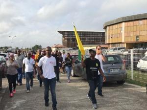 Davy Rimane, secrétaire général UTG éclairage, en tête du cortège au départ du siège d'EDF vers le tribunal de Cayenne. Photo : G. Vernet