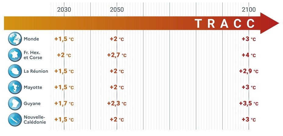 Après l’Hexagone, Météo-France décline la TRACC (Trajectoire de Réchauffement de Référence pour l’Adaptation au Changement Climatique) pour les Outre-mer. Cette référence nationale s’appuie sur trois niveaux de réchauffement global : +1,5 °C en 2030, +2 °C en 2050 et +3 °C en 2100.